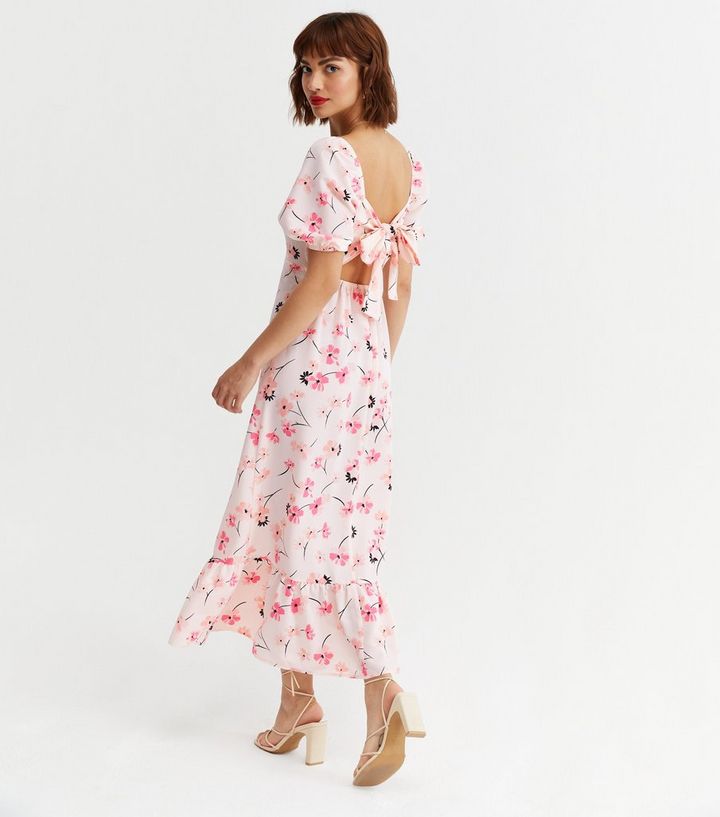 Pink Floral Tie Back Puff Sleeve Midi Dress New Look